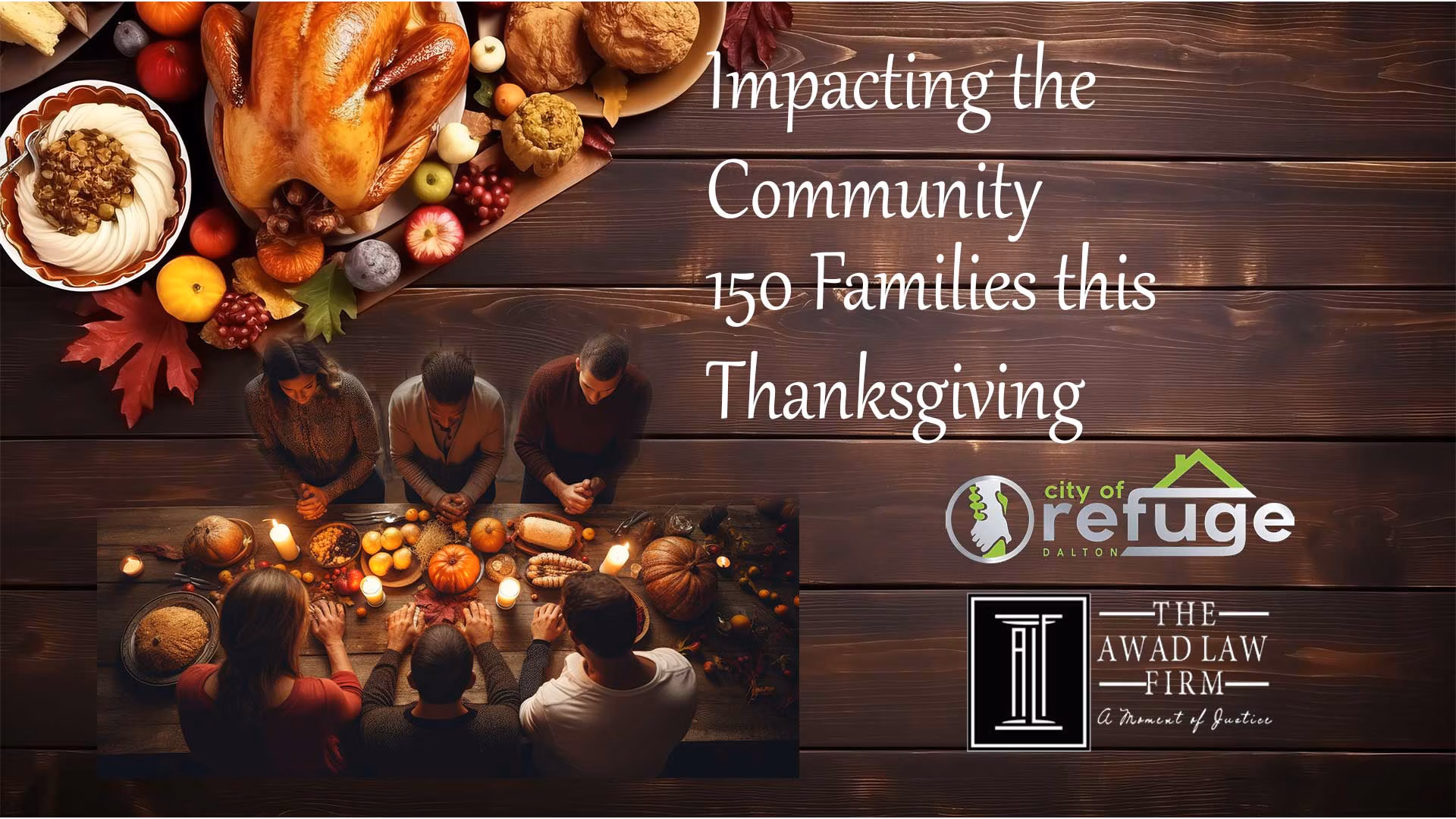 Inspired by Tony Robinsons’ goal to feed 150 million families over the holiday, Ibrahim and the Awad Law firm working through the Dalton City of Refuge donated 150 turkeys this past Thanksgiving to help needy families in the community.